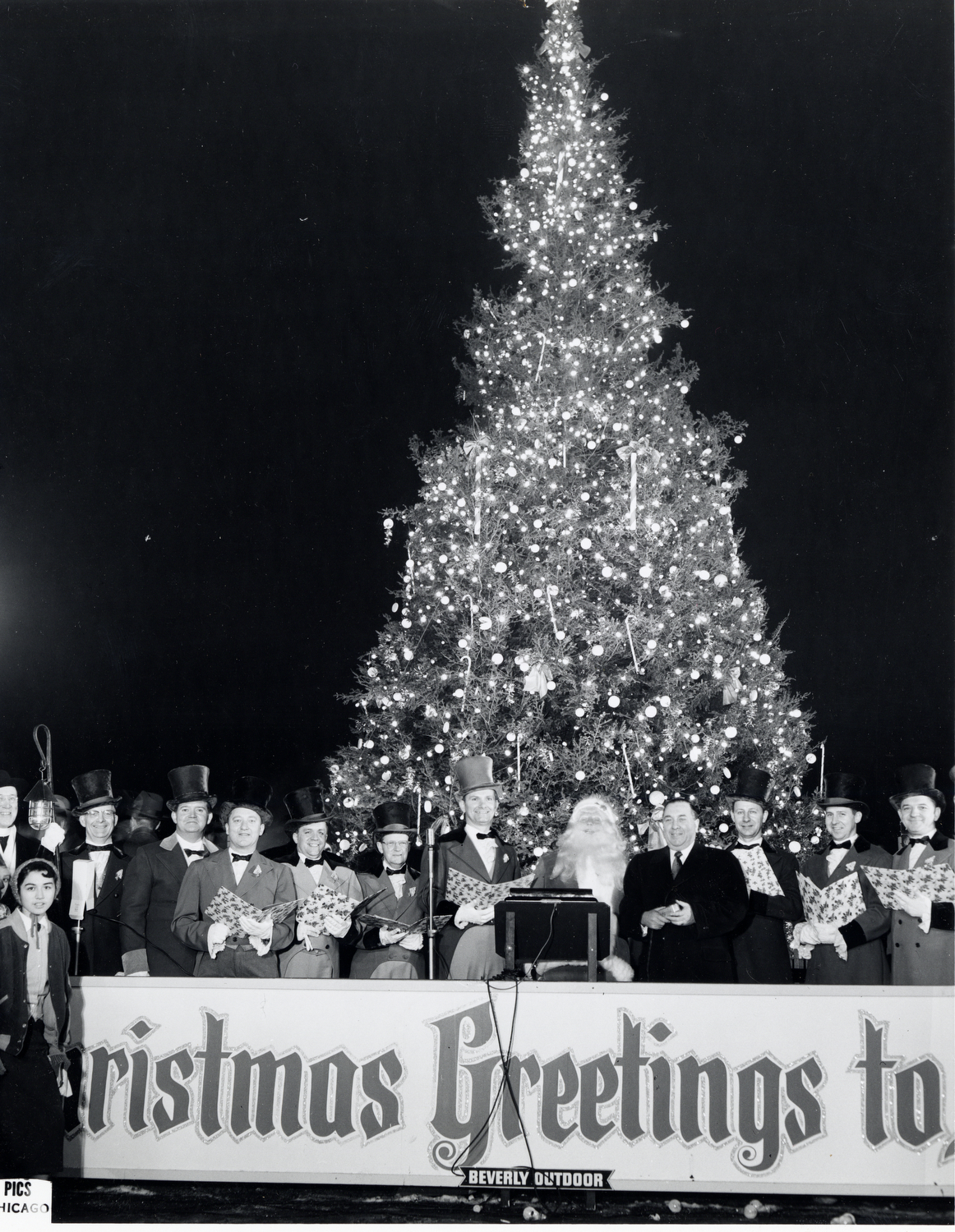 img: [Richard J. Daley with Santa, carolers, and tree at outdoor holiday event, 1959. Photo: Pics Chicago. RJD_04_01_0014_0006_017]