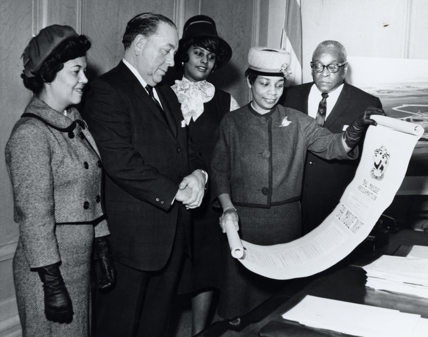 img: [Richard J. Daley surrounded by five women wearing national costumes in honor of Captive Nations Week, 1960. Photo R. E. Murphy. RJD_04_01_0019_0006_001]
