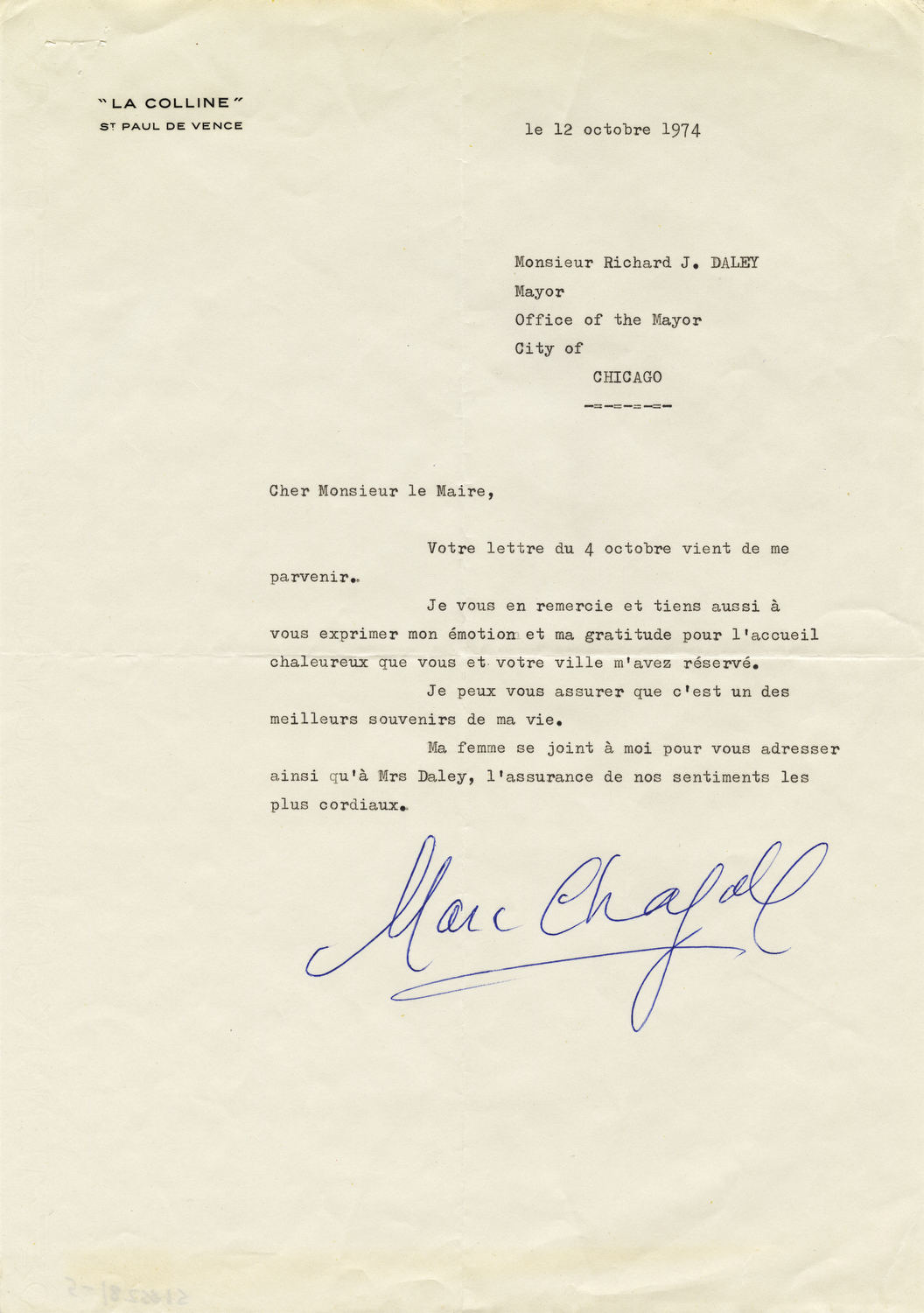 - 1 2021-03-01T15:47:29-06:00 Written letter: Marc Chagall, October 12, 1974 5 plain 2021-03-01T15:50:10-06:00 Letter written by Marc Chagall to Mayor Richard J. Daley, October 12, 1974. RJD_01_02_0001_0005_002. Richard J. Daley collection, University of Illinois Chicago.